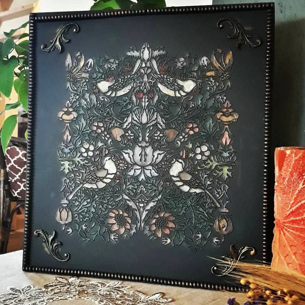 Великолепный трафарет. Чёткий рисунок, большое количество деталей делает его насыщенным, но не перегруженым. Очень удобный размер. С лёгкостью наносила на мелкие детали и на мебельный фасад.